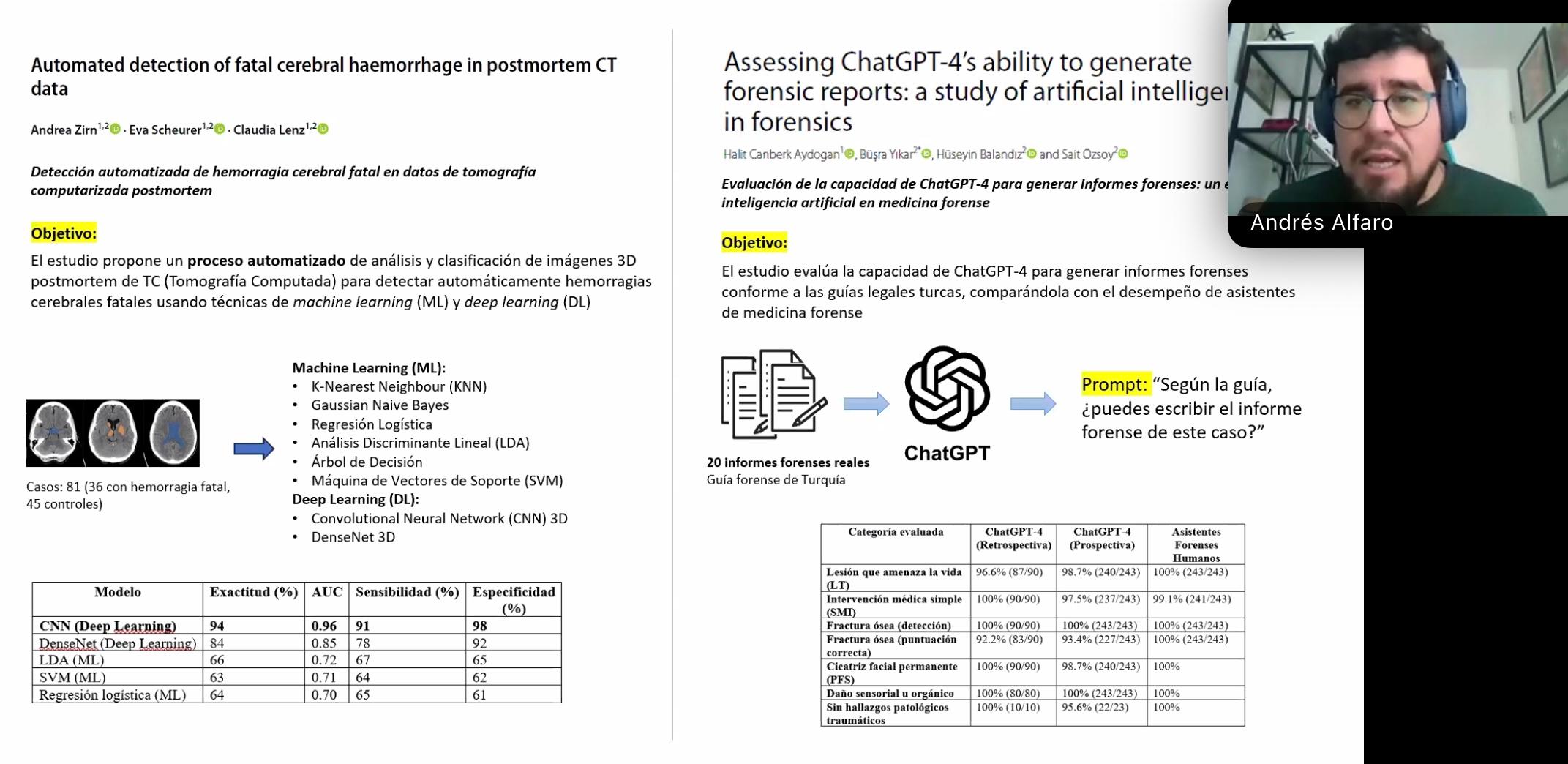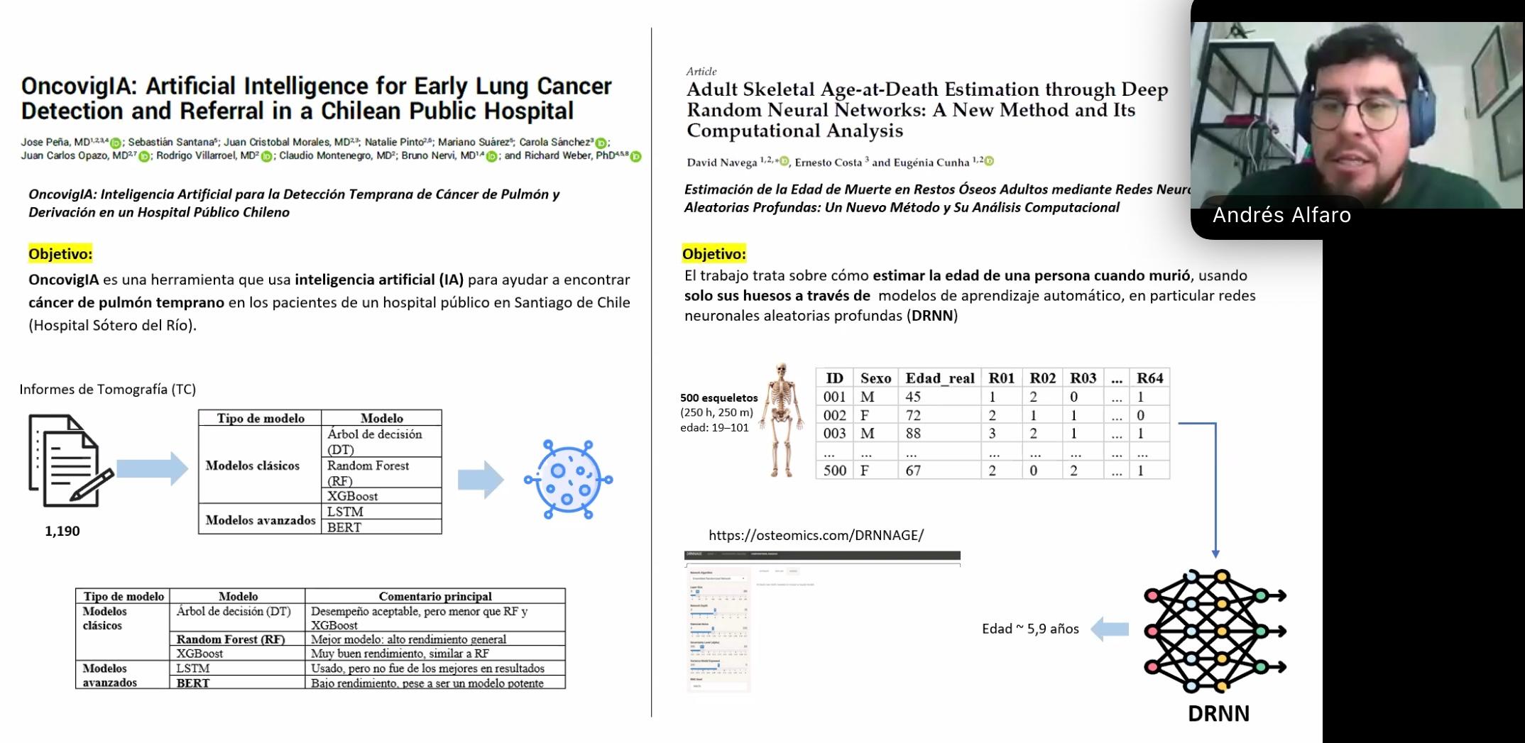 En la jornada de clausura, realizada el 7 de noviembre de 2025, Alfaro presentó la ponencia titulada “Inteligencia Artificial y sus potencialidades en las Ciencias Forenses: una mirada desde la academia”, donde abordó los avances y aplicaciones de la inteligencia artificial (IA) en el ámbito forense, destacando su impacto en la detección temprana de patologías, la estimación de edad en restos óseos, el análisis automatizado de imágenes postmortem y la generación asistida de informes médico-legales mediante modelos de lenguaje como ChatGPT-4.
