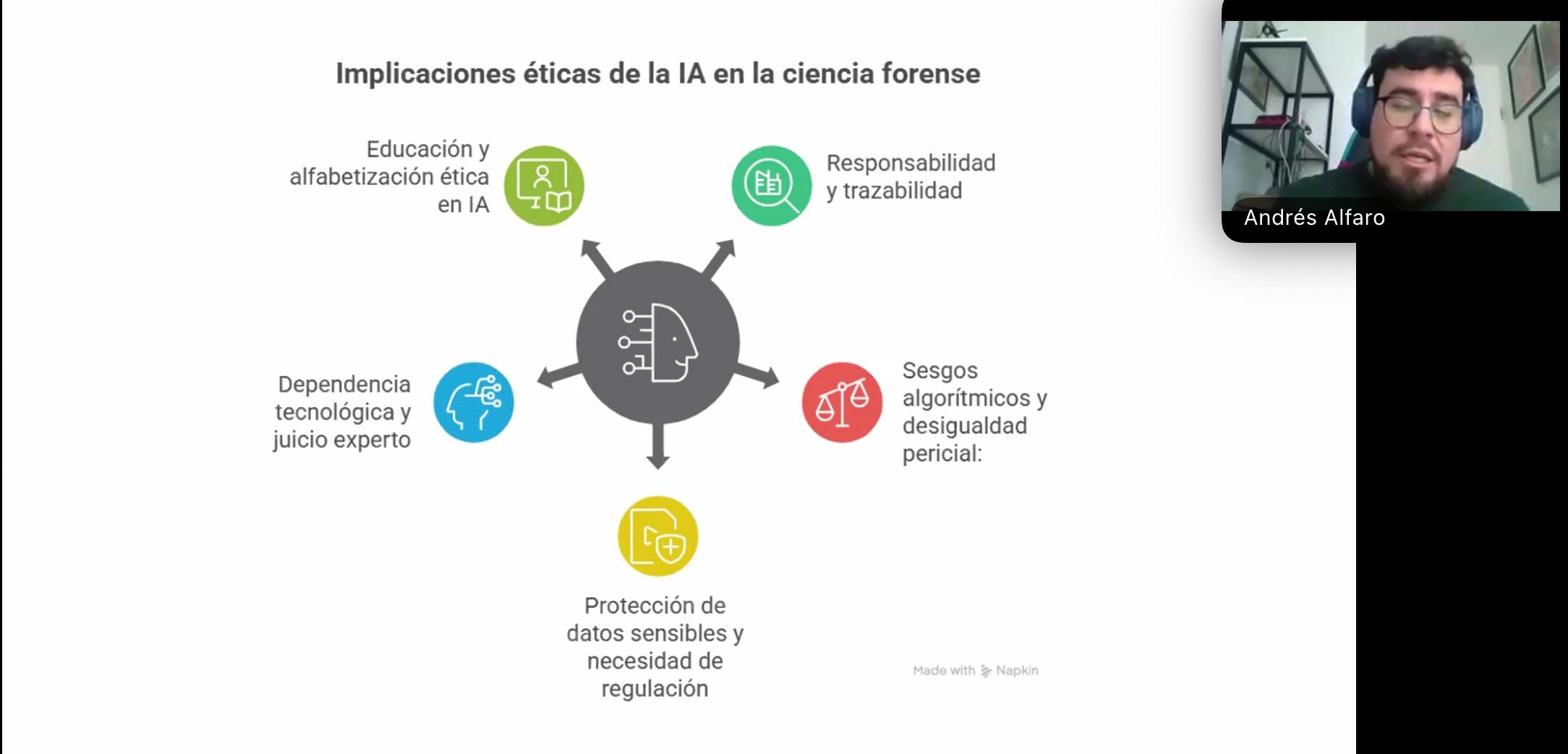 Durante su exposición, el académico enfatizó la importancia de la ética, la transparencia algorítmica y la supervisión humana en la aplicación de la IA a las ciencias forenses, subrayando que estas herramientas deben complementar la labor de los especialistas, fortaleciendo la precisión y eficiencia de los procesos periciales.