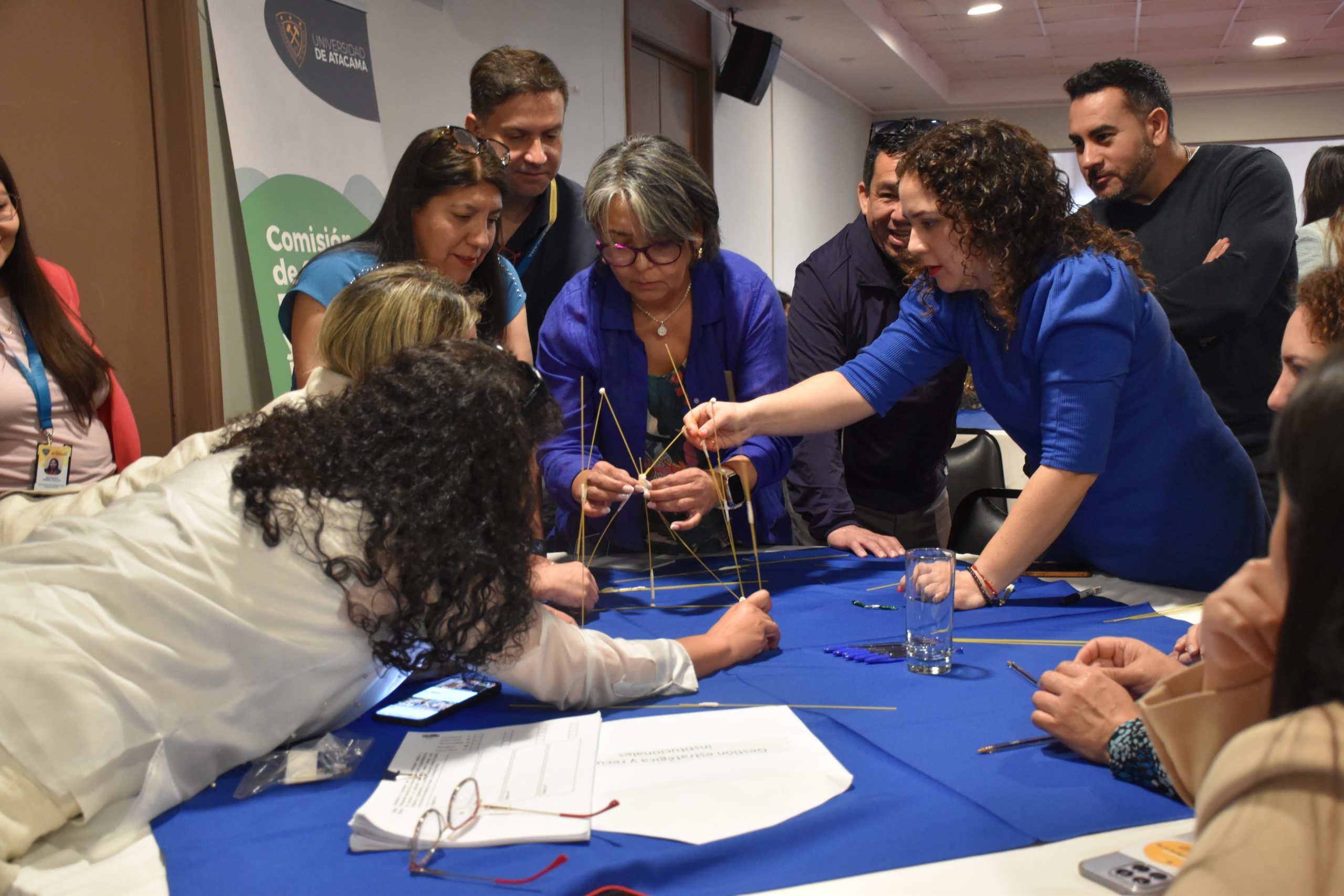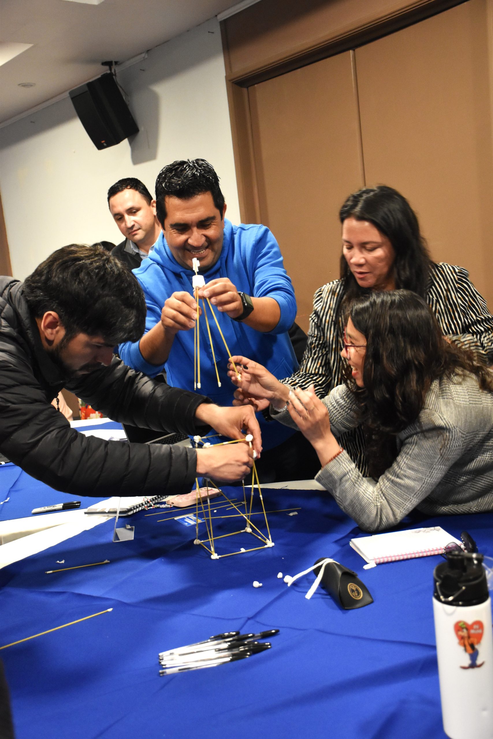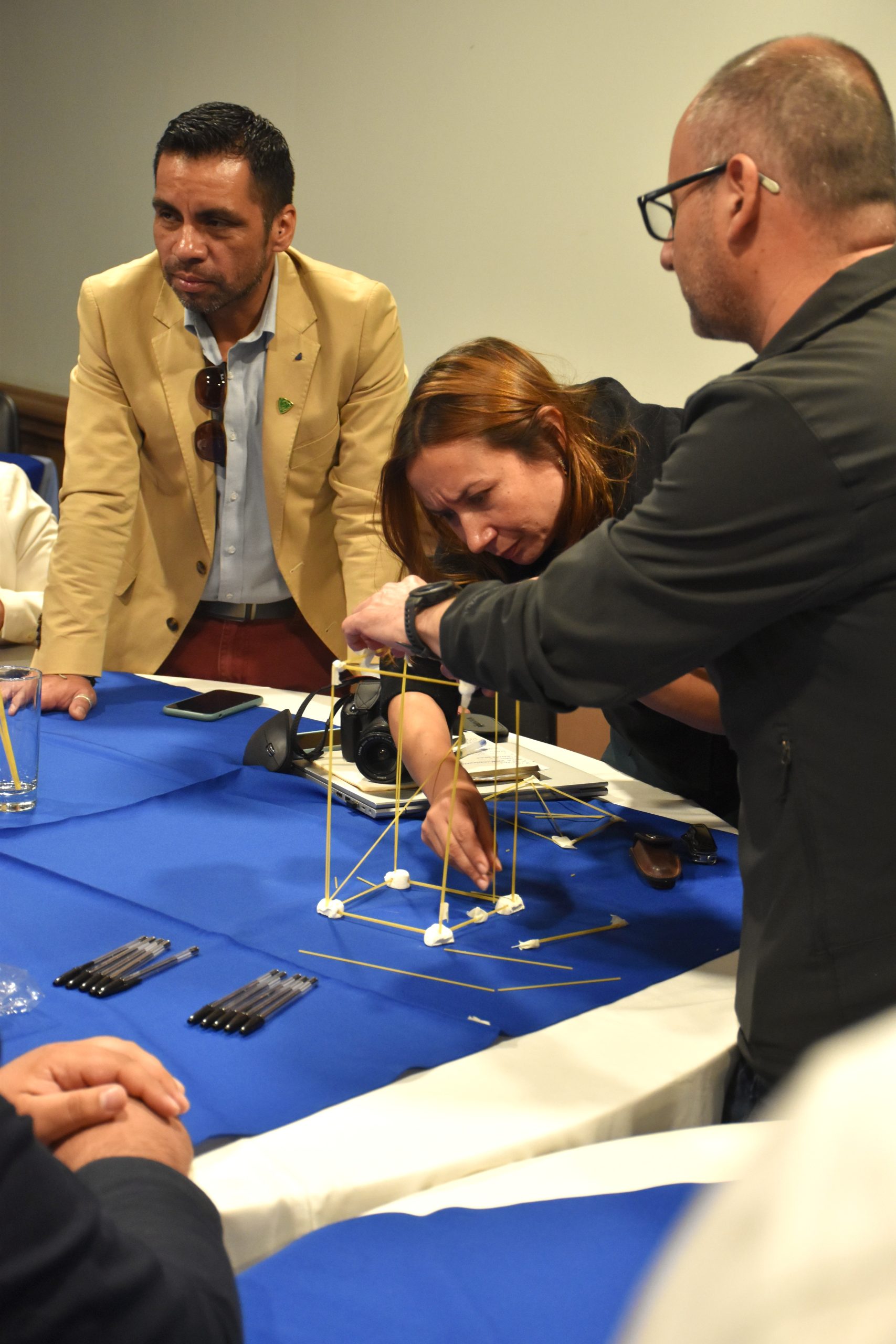 Para comenzar la jornada de trabajo colectivo, los participantes se enfrentaron al desafío de construir una torre con fideos y malvavisco. Esta actividad lúdica y exigente sirvió para simular las complejidades del trabajo en equipo, destacando la necesidad de fomentar la comunicación efectiva, la empatía y la capacidad de llegar a acuerdos para superar obstáculos y cumplir el objetivo común.